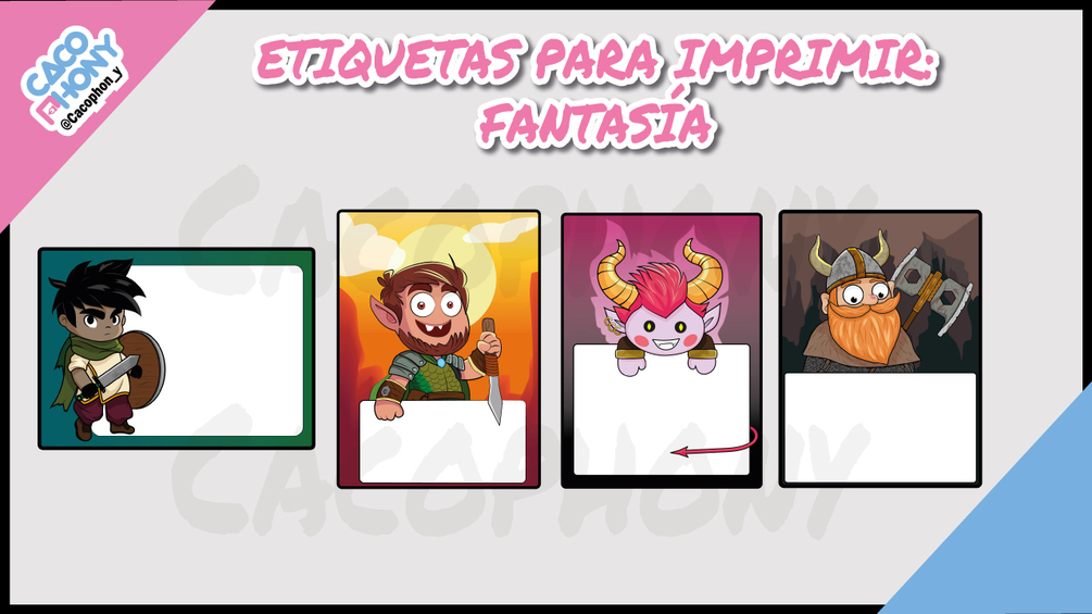 Etiquetas de aventureros de fantasía, listos para su siguiente misión. Puedes imprimir en papel de stickers - calcomanía- pegatina y decorar tus cuadernos.
